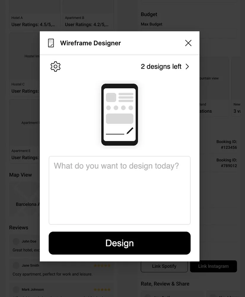 In Figma, I used the plugin Wireframe Designer which generated wireframes with AI. As this is my first time using this plugin, I wanted to learn how to effectively write prompts in order to get the desired results as this free plugin only came with 10 credits.